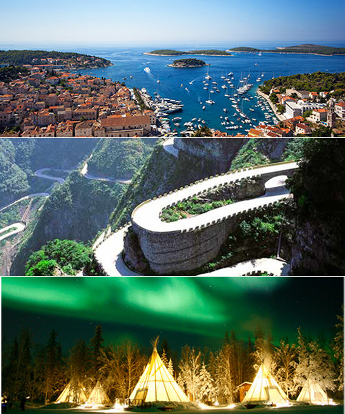 올해 해외여행의 새로운 명소로 인기를 모을 것으로 기대되는 곳들. 맨 위쪽부터 유럽여행 신흥 명소로 부상한 크로아티아 두브로브니크, 한 폭의 산수화를 연상케 하는 중국 장가계, 오로라투어의 명소로 유명한 캐나다 옐로나이프. 사진제공|인터파크