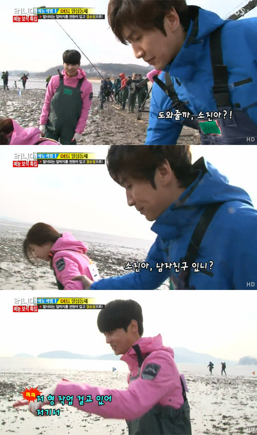 이날 갯벌에서 진행된 ‘머드 일심동체’ 미션을 위해 멤버들은 일제히 출발선으로 움직였다. 이동 중 소진은 갯벌을 제대로 걷지 못해 휘청였고, 이를 본 이광수는 다른 팀임에도 자상하게 손을 내밀며 “도와줄까 소진아”라고 말했다.