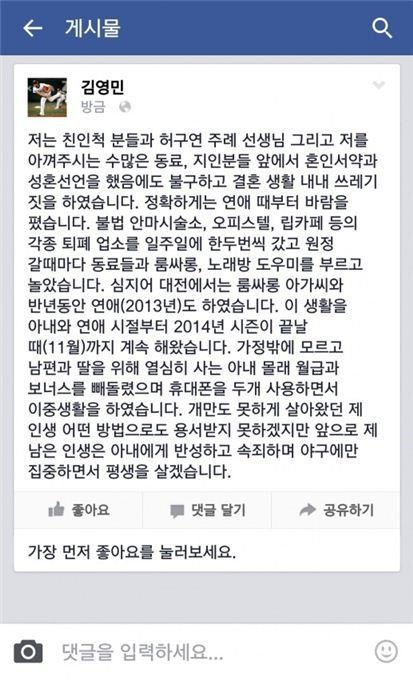 이를 통해 김영민은 “정확하게는 연애 때부터 바람을 폈습니다. 불법 안마시술소, 오피스텔, 립카페 등의 각종 퇴폐업소를 일주일에 한 두 번씩 갔고 원정 갈 때마다 동료들과 룸싸롱, 노래방 도우미를 부르고 놀았습니다. 심지어 대전에서는 룸싸롱 아가씨와 반년동안 연애(2013년)도 했습니다. 이 생활을 아내와 연애 시절부터 2014년 시즌이 끝날 때까지 계속 해왔습니다”라고 털어놓았다.