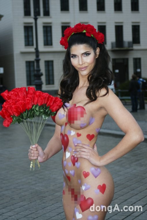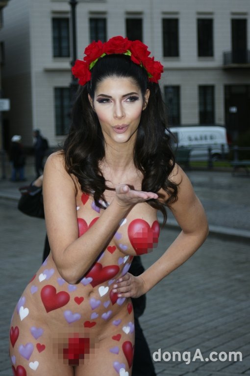 평소에도 과감한 노출을 즐기기로 유명한 미카엘라 쉐퍼는 전신에 하트 무늬를 그린 파격적인 바디 페인팅으로 주위를 놀라게했다.