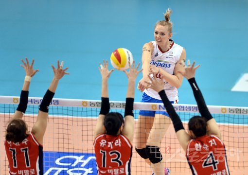 10일 오후 대전 충무체육관에서 열린 ‘2014-2015 NH농협 여자배구 V리그’ KGC인삼공사와 도로공사의 경기에서 도로공사 니콜이 스파이크를 때리고 있다.