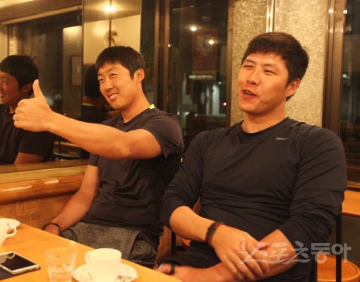 “훈련량이요? 정말 최고예요.” 한화 배영수(왼쪽)가 일본 고치 숙소에 있는 한 커피숍에서 진행된 스포츠동아와 인터뷰에서 엄지손가락을 치켜들며 지옥훈련 경험담을 생동감 있게 전하고 있다. 옆에 있던 권혁도 웃음을 머금고 김성근 감독의 지옥훈련을 증언했다. 고치(일본)|이재국 기자 keystone@donga.com 트위터 @keystonelee