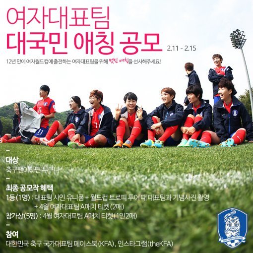 대한축구협회(KFA)가 12년 만에 FIFA 여자 월드컵에 출전하는 여자 축구국가대표팀을 위한 대국민 애칭 공모를 실시한다.
