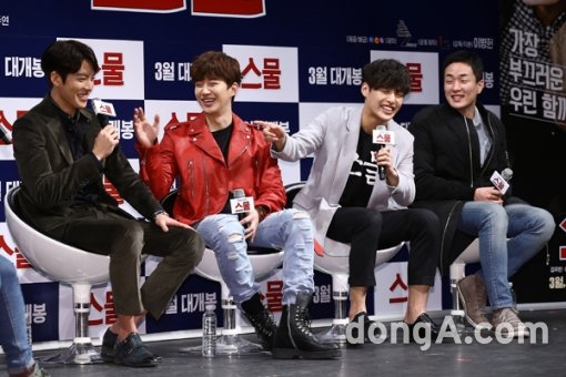 배우 김우빈(왼쪽부터), 이준호, 강하늘, 이병헌 감독이 12일 오전 서울 강남구 압구정CGV에서 열린 영화 ‘스물’ 제작보고회에서 질의응답을 하고 있다.