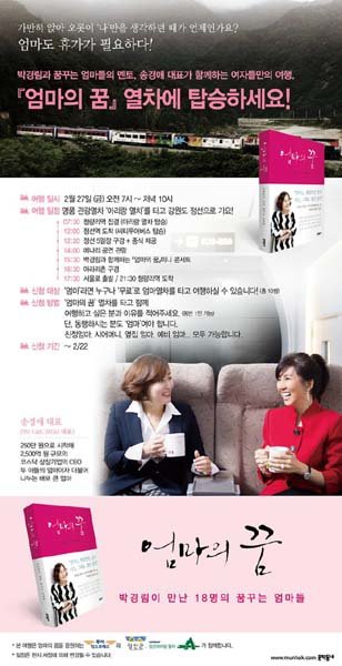 ‘엄마의 꿈열차’ 여행은 27일 오전 서울 청량리 역에서 아리랑 열차를 타고 강원도 정선으로 향한다. 이들이 타는 정선아리랑 열차는 새마을호 객차를 개조해 정원 200명으로 객실 4량과 기관차와 발전차로 편성된 관광열차다. 종착역인 정선 아우라지역에서 이곳의 유서 깊은 5일장을 구경한 뒤 정선문화예술회관에서 엄마들을 위한 ‘엄마의 꿈’ 북 콘서트를 연다.