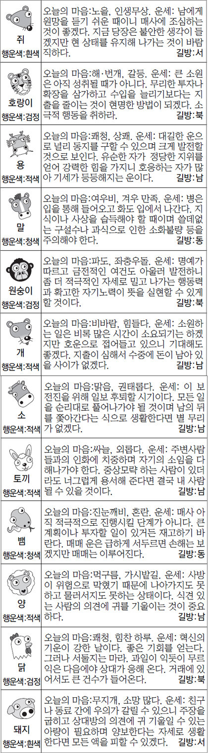 금일복권, 주식, 부동산매입 행운의 띠: 소,뱀,닭(토요일:호랑이,말,개)