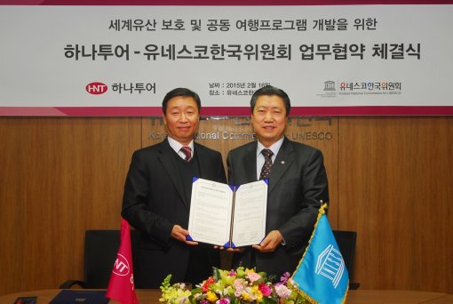 최현석 하나투어 대표이사, 민동석 유네스코한국위원회 사무총장 등이 참석한 업무협약식에서 양측은 세계유산 관련 여행상품을 공동기획하고 기부금을 조성해 개도국 지원 및 유네스코 세계유산 보호기금 등으로 활용할 것을 약속했다.