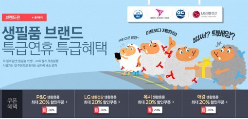 이번 ‘생필품 브랜드 통합전-특급연휴 특급혜택’ 기획전은 LG생활건강, 애경, P&G, 옥시 등 4개 인기 생필품 브랜드가 참여한다. 행사상품을 최대 20% 할인(5000원 이상 구매시)해주는 쿠폰을 브랜드별로 선착순 1000장씩 발행한다. 또한 브랜드별 대표 세제, 섬유유연제, 구강케어 상품도 일주일간 특별 할인가로 선보인다.