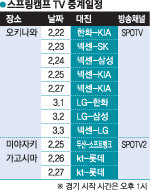 한편 17일 한화-SK전을 시작으로 국내 프로야구 팀들의 스프링캠프 연습경기가 줄줄이 이어진다. 야구팬의 갈증을 해소하기 위해 지난해에 이어 올해도 일본에서 열리는 연습경기가 TV로 생중계된다(표 참조). 총 11경기가 편성됐다. 25일과 27일에는 SPOTV와 SPOTV2 채널에서 하루 2경기를 중계한다.