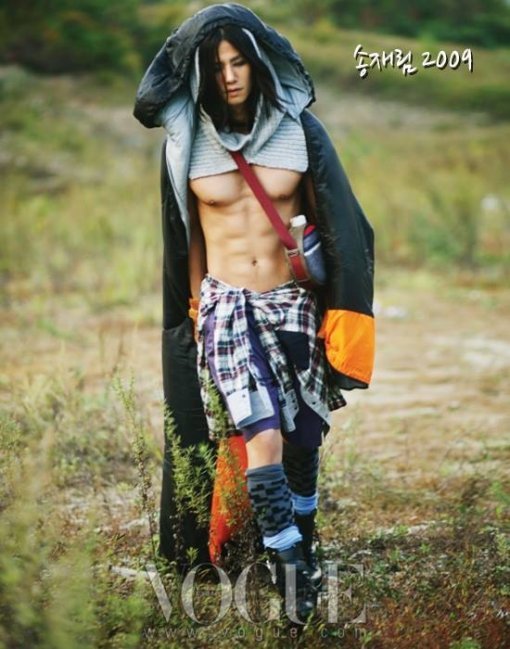이 사진에서 송재림은 조각 같은 식스팩 복근을 드러내고 진한 스모키 메이크업을 하고 있다. 특히 장발의 헤어 스타일과 옷을 입다 말고 걸친 모습이 야성적인 매력을 느끼게 한다.