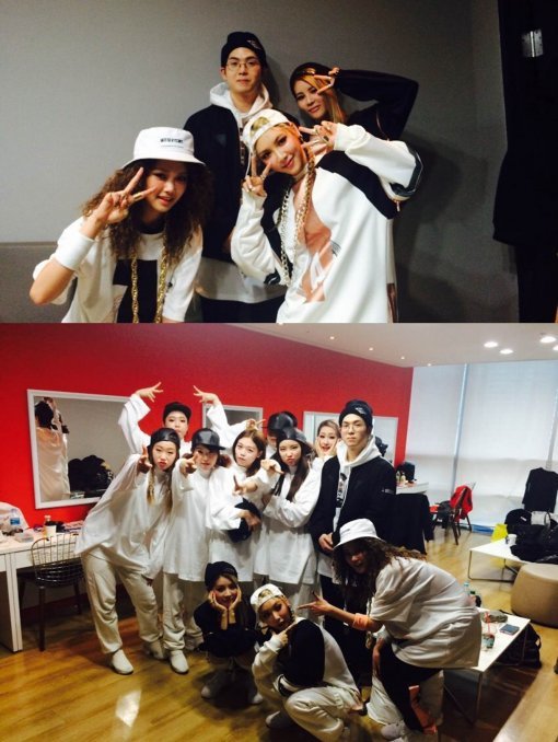 공개된 사진에는 무대위의 카리스마대신 장난기 가득한 러버소울이 포즈를 취한채 선배인 매드클라운이 미소와 함께 멋적은 포즈를 취하고 있으며 여성댄서들도 함께 한 사진에서는 청일점으로 화이트와 블랙 의상이 조화롭다.