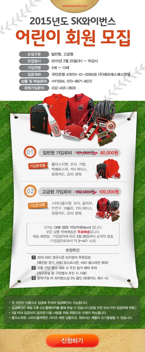 프로야구 SK와이번스가 25일(수)부터 ‘2015시즌 어린이회원’을 선착순 모집한다.
