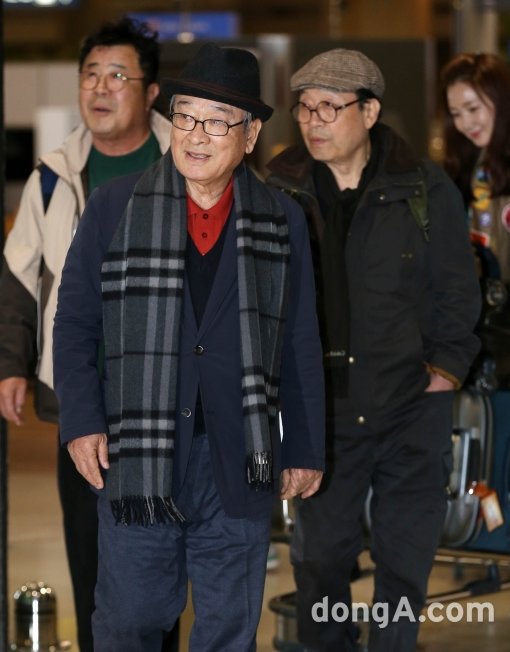 배우 이순재(가운데)가 25일 오후 인천국제공항을 통해 입국하고 있다.