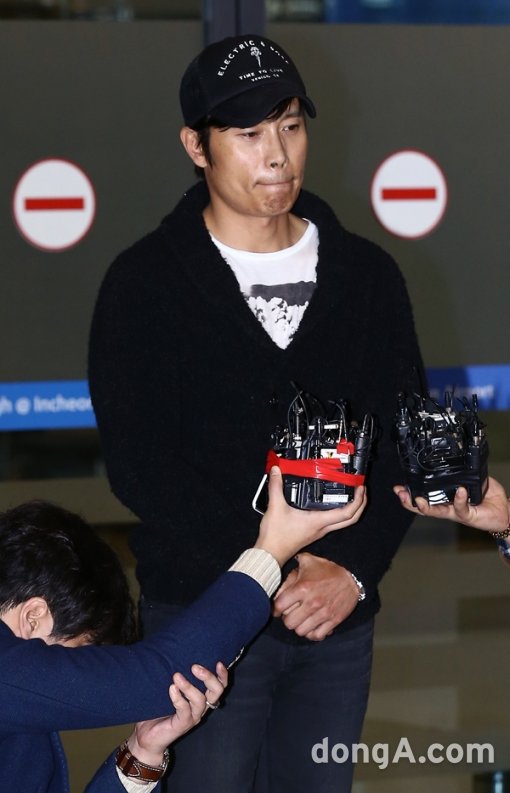 배우 이병헌이 26일 오전 아내 이민정과 함께 인천국제공항을 통해 입국해 협박논란에 대한 입장을 말하고 있다.