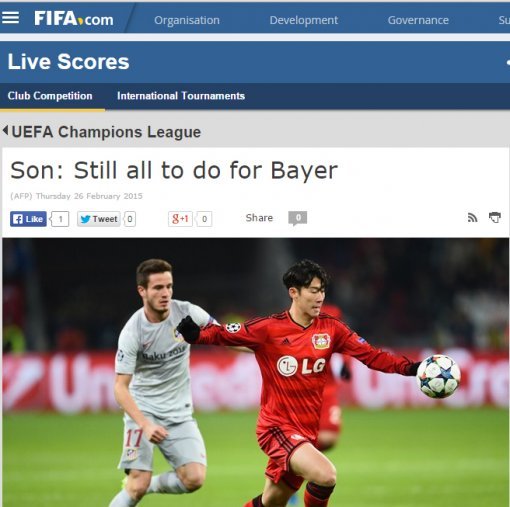 '손세이셔널' 손흥민(23·바이엘 레버쿠젠)이 국제축구연맹(FIFA) 홈페이지 메인을 장식했다.