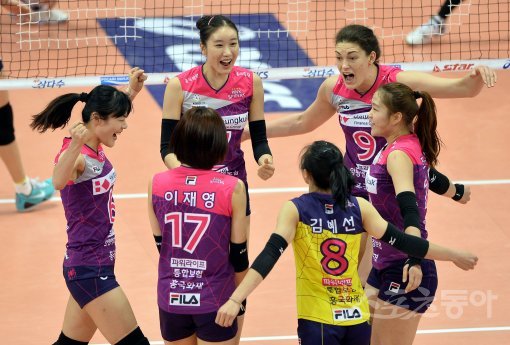 26일 오후 수원 실내체육관에서 열린 ‘2014-2015 NH농협 프로배구’ 여자부 현대건설과 흥국생명의 경기에서 흥국생명 김혜진과 루크가 득점 후 기뻐하고 있다.