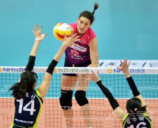 26일 오후 수원 실내체육관에서 열린 ‘2014-2015 NH농협 프로배구’ 여자부 현대건설과 흥국생명의 경기에서 흥국생명 루크가 스파이크를 때리고 있다.