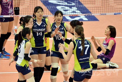 26일 오후 수원 실내체육관에서 열린 ‘2014-2015 NH농협 프로배구’ 여자부 현대건설과 흥국생명의 경기에서 현대건설 선수들이 득점 후 기뻐하고 있다.