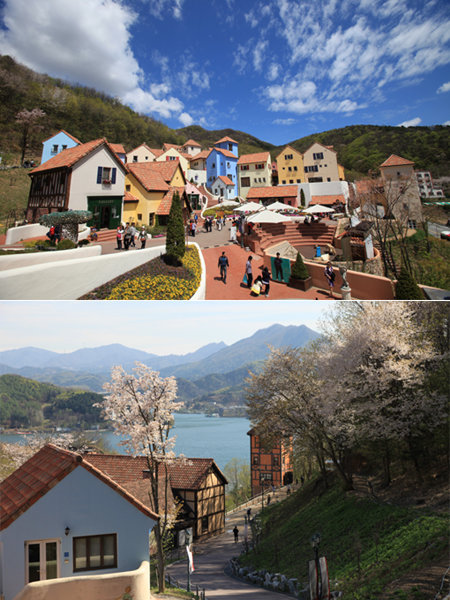 가평 쁘띠 프랑스는 파스텔 색상의 이국적인 예쁜 건물들(위쪽)과 청평호수를 바라다보는 풍광이 매력적이다. 사진제공|쁘띠프랑스