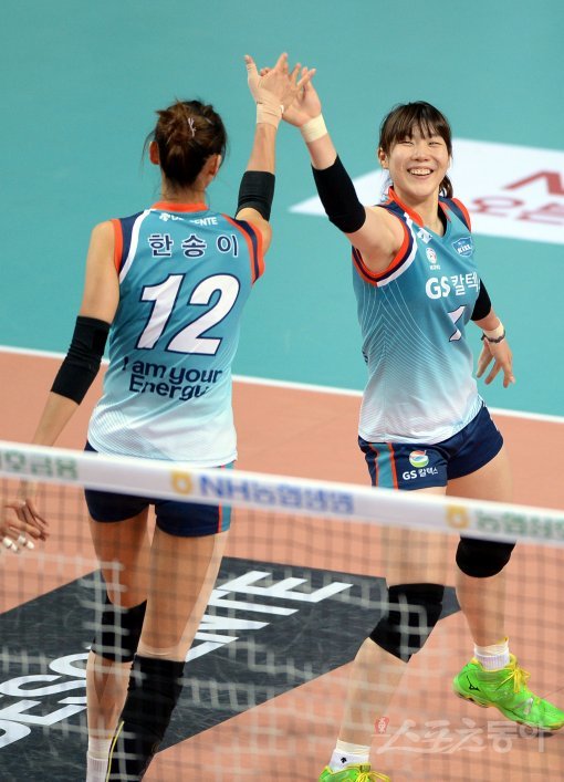 1일 오후 서울 장충체육관에서 열린 ‘2014-2015 NH농협 V리그 여자 프로배구’ GS칼텍스와 흥국생명의 경기에서 GS칼텍스 이소영이 득점 후 한송이와 기쁨을 나누고 있다.