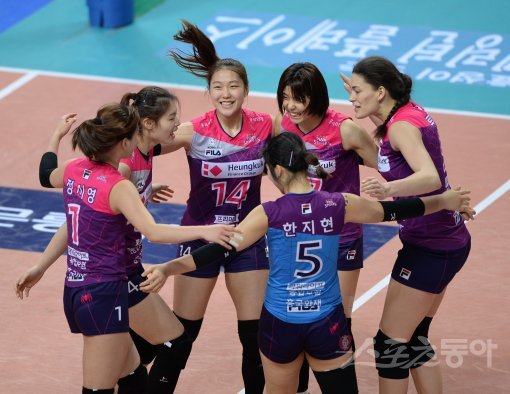 1일 오후 서울 장충체육관에서 열린 ‘2014-2015 NH농협 V리그 여자 프로배구’ GS칼텍스와 흥국생명의 경기에서 흥국생명 선수들이 득점 후 기쁨을 나누고 있다.