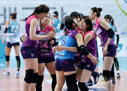 1일 오후 서울 장충체육관에서 열린 ‘2014-2015 NH농협 V리그 여자 프로배구’ GS칼텍스와 흥국생명의 경기에서 흥국생명이 세트스코어 3-1로 역전승을 거둔 후 선수들이 기뻐하고 있다. 장충|임민환 기자 minani84@donga.com 트위터 @minani84