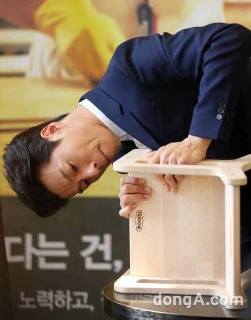 배우 이천희가 4일 오전 서울 마포구 동교동 카페 꼼마2호점에서 열린 에세이 '가구 만드는 남자' 출판 기념 간담회에서 파파체어 시연을 하고 있다.