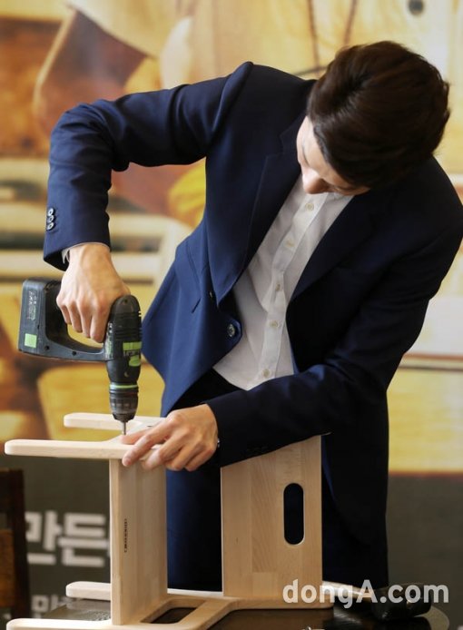 배우 이천희가 4일 오전 서울 마포구 동교동 카페 꼼마2호점에서 열린 에세이 '가구 만드는 남자' 출판 기념 간담회에서 파파체어 시연을 하고 있다.