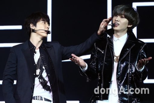 슈퍼주니어-D&E(동해&은혁) 5일 오후 서울 강남구 SMTOWN COEX ARTIUM에서 슈퍼주니어 유닛, 슈퍼주니어-D&E(동해&은혁) 첫 앨범 발매 기념 기자간담회 및 쇼케이스에서 멋진 공연을 하고 있다.