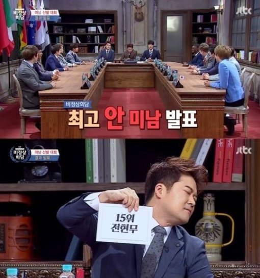 이어 상위권 못지않게 치열한 접전을 펼쳤던 하위권이 발표됐다. 투표 결과 하위권 TOP3가 모두 의장단(전현무-유세윤-성시경)인 것으로 밝혀졌다. 특히 15명 중 15위로 꼴찌를 기록한 전현무는 눈을 감고 직접 꼴찌를 발표해 웃음을 자아냈다. 그는 결과에 대해 “왜들 이래~”라며 불평해 주위를 폭소케 했다.