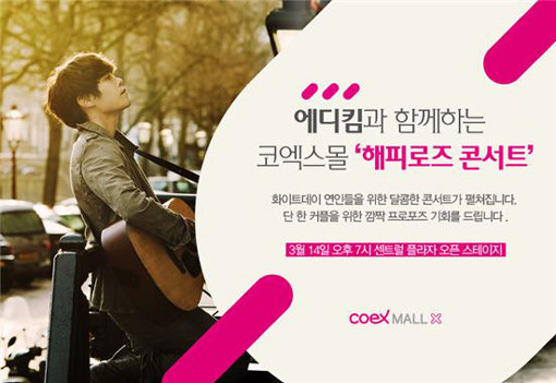 코엑스몰(대표 박영배)이 화이트데이인 14일 국내 유명가수 에디킴을 초청해 공개 프러포즈 등 미니콘서트 개념의 ‘해피로즈 콘서트’를 실시한다.