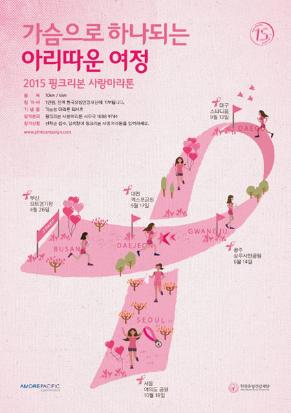 ㈜아모레퍼시픽(대표이사 심상배)과 한국유방건강재단은 2015년도 ‘핑크리본 사랑마라톤’ 전국 릴레이의 참가신청 접수를 시작한다. 국내 최대 핑크리본캠페인 행사인 ‘아모레퍼시픽 핑크리본 사랑마라톤’은 유방건강 관리를 위한 유용한 정보를 제공하며, 더불어 저소득층 유방암 환자를 위한 수술치료비 지원 기금을 마련하고자 15년째 이어 온 대표적인 유방건강 의식향상 캠페인 프로그램이다.