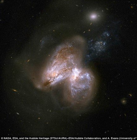 하지만 더 놀라운 장면은 산봉우리 꼭대기에 탐조등처럼 걸려 있는 것 처럼 보이는 밝은 성운이다. 마치 먼 바다를 비추는 등대처럼 보이기도 하는데, 이것은 성운 속에서 새로 태어난 별이 양극방향으로 제트를 방출해 생긴 것이다.