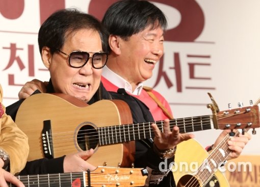 가수 조영남(왼쪽)이 11일 오후 서울 여의도 63시티에서 열린 '2015 쎄시봉 친구들 콘서트' 기자간담회에 참석해 포토타임을 하고 있다.