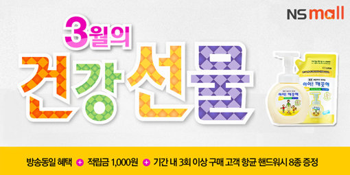 NS홈쇼핑이 20일까지 ‘3월의 건강선물’(사진) 프로모션을 실시한다. TV홈쇼핑(NS몰 라이브·모바일 TV 라이브·T-COM 포함)에서 방송되는 3만원 이상 상품을 3회 이상 구매하는 모든 고객에게 ‘아이깨끗해’ 향균 핸드워시 8종세트(본품 250ml 2개·리필 200ml 6개)를 증정하는 이벤트다. 이 기간 내 방송되는 상품에 한해서만 적용된다. 취소, 반품 시 사은품이 제외되며 1인 1회로 중복 지급은 안 된다. 또 보험, 여행, 휴대폰, 서비스 등 일부상품은 제외된다.