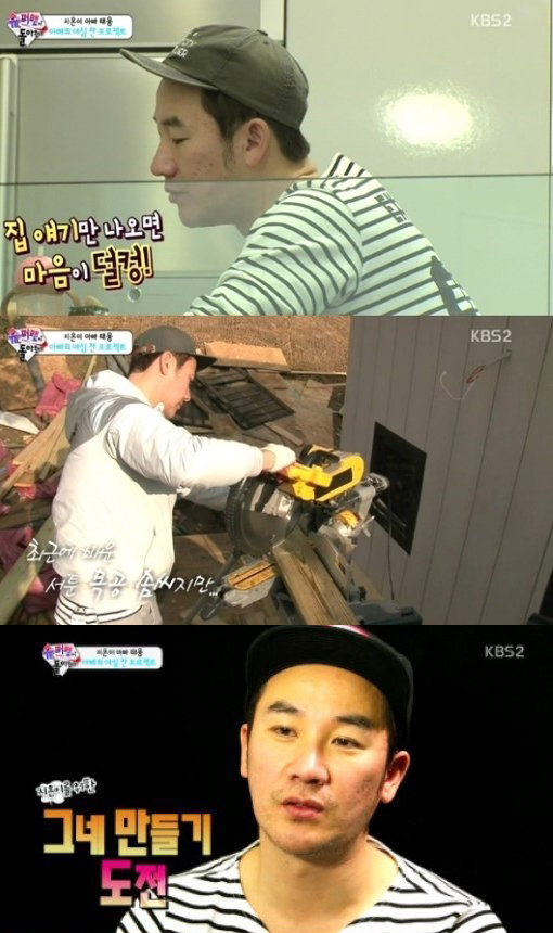 이날 방송에서 엄태웅의 아내는 아침 식사 자리에서 "집 공사가 아직 끝나지 않아 한 쪽이 휑하다"고 말했다. 그러자 엄태웅은 "생각해 둔 게 있다. 나무 그네를 만들려고 한다"고 밝혔다.
