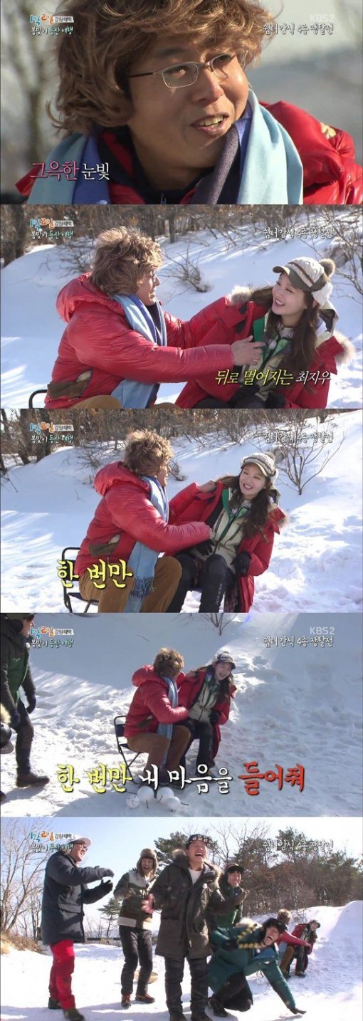이날 멤버들은 산 중턱에서 제작진이 마련한 간식을 먹기 위해 ‘겨울연가’ 재연에 나섰다. 재연해야 할 장면은 배용준과 최지우의 유명한 키스신이었다.