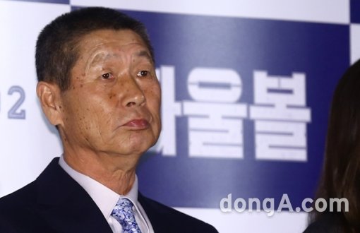 김성근 야구감독이 16일 오후 서울 성동구 왕십리CGV에서 열린 영화 ‘파울볼’ 언론시사회에서 질문에 답하고 있다.