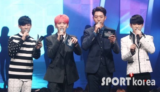 갓세븐 주니어, 샤이니 키, 씨엔블루 이정신, 갓세븐 뱀뱀(왼쪽부터)이 19일 오후 서울 마포구 상암동 CJ E&M센터에서 진행된 Mnet ‘엠카운트다운’에 출연해 MC를 보고 있다.