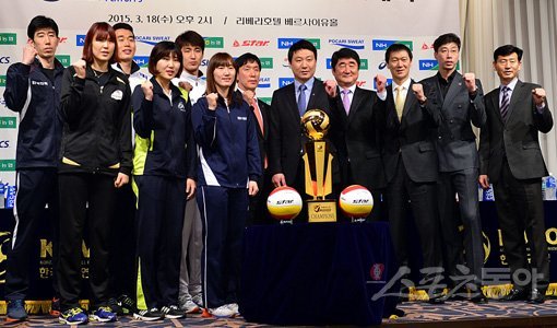 18일 서울 청담동 리베라호텔에서 열린 ‘NH농협 2014∼2015 V리그’ 포스트시즌 미디어데이에서 각 팀 감독과 선수들이 선전을 다짐하고 있다. 김진환 기자 kwangshin00@donga.com 트위터 @kwangshin0521