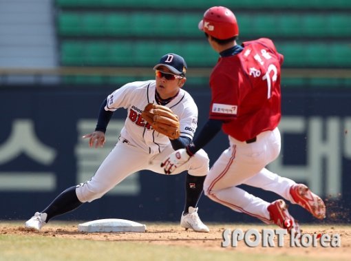 20일 오후 서울 잠실야구장에서 열린 ‘2015 타이어뱅크 KBO 리그’ 프로야구 시범경기 두산 베어스와 KIA 타이거즈의 경기 KIA 3회초 1사 1루에서 4번 나지완 타석 때 1루주자 강한울이 2루도루를 시도했으나 두산 최주환에게 태그아웃 되고 있다.