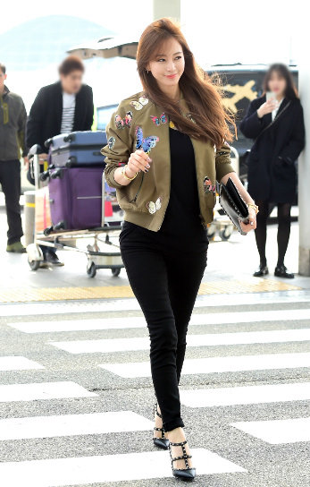 한예슬은 출국 당시 다채로운 나비의 로맨틱함과 보이시함이 공존하는 블루종 자켓에 시크한 락스터드 느와 클러치와 하이힐을 매치하여 감각적인 믹스매치를 선보였다.