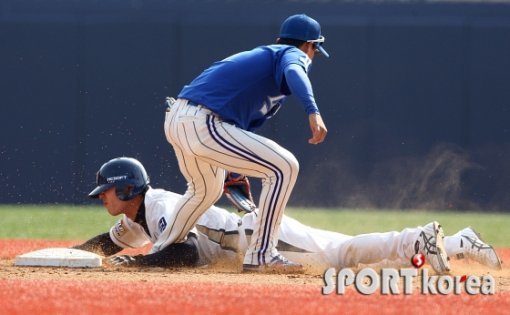 20일 오후 마산야구장에서 열린 ‘2015 타이어뱅크 KBO리그’ 프로야구 NC 다이노스 대 삼성 라이온즈 시범경기 7회말 2사 1루에서 NC 테임즈 타석 때 도루를 시도한 1루주자 김성욱이 삼성 유격수 김재현에게 태그아웃되고 있다.