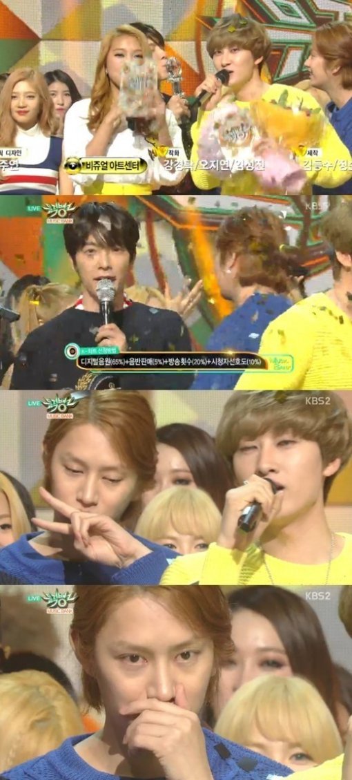 1위 호명 후 동해와 은혁은 “멤버들이 가장 보고 싶다”고 소감을 전했다. 이 자리에는 멤버 희철도 자리했다.