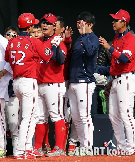 21일 오후 수원야구장에서 열린 ‘2015 타이어뱅크 KBO 리그’ 프로야구 시범경기 kt 위즈와 KIA 타이거즈의 경기 KIA 9회초 2사 1,2루 때 4번대타 이인행의 적시타로 2루주자 최용규가 역전득점을 올리고 덕아웃에서 나지완, 양현종 등 동료선수들의 환영을 받고 있다.