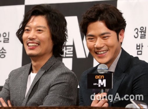 배우 박희순(왼쪽)과 김강우가 23일 오후 서울 강남구 임피리얼팰리스호텔에서 열린 OCN '실종느와르M' 제작발표회에 참석해 시청률 공약에 대해 이야기하고 있다.