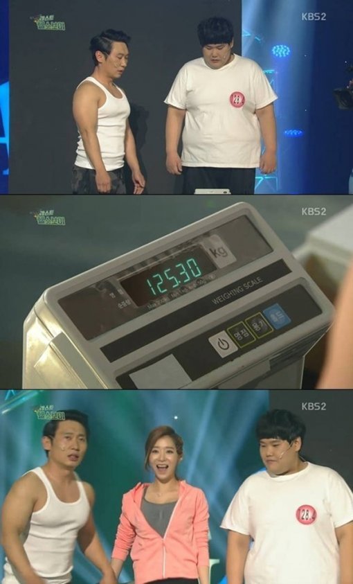 이어 김수영은 지난주 128.4kg에서 125.3kg로, 약 3kg 몸무게가 감량됐다. 이들의 트레이너인 개그맨 이승윤은 “김수영은 7주 동안 총 43kg를 감량했다. 여자 한 명 몸무게 만큼 빠진 거다. 이제 한 명만 더 빼면 된다”고 소개했다.