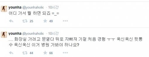 25일 새벽 윤하는 자신의 트위터에 “화장실 가려고 문열다 뒤로 자빠져 기절 처음 경험. 욱신욱신 뒷통수 욱신욱신 이거 병원 가봐야 하나요?”라고 전한 뒤 이어 “어디 가서 뭘 하면 되죠”라는 글을 연달아 게재했다.