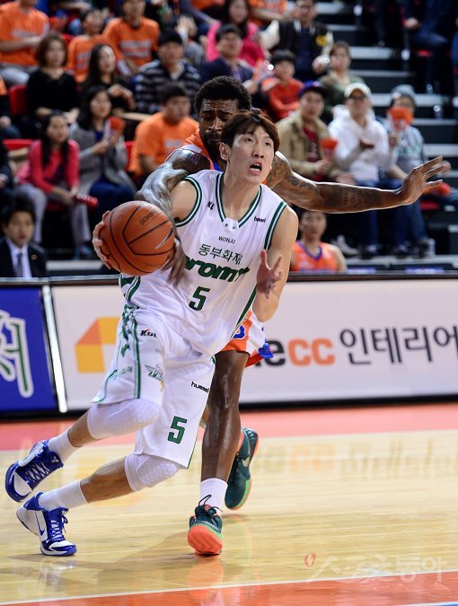 25일 오후 인천삼산실내체육관에서 열린 ‘2014~2015 KCC프로농구’ 4강 플레이오프 인천 전자랜드 대 원주 동부 경기에서 원주 동부 두경민이 인천 전자랜드 리카르도 포웰의 수비를 뚫고 돌파를 하고 있다.