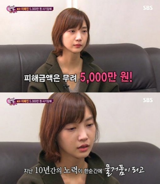 또한 이해인은 “피해금액은 5000만원이다. 이사를 가려고 보증금으로 마련해놓은 거였다”며 “힘들게 모아온 건데 그걸 그렇게…”라고 말해 안타까움을 자아냈다.